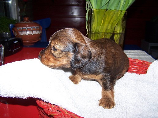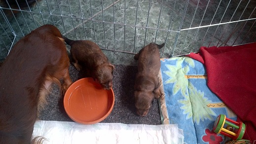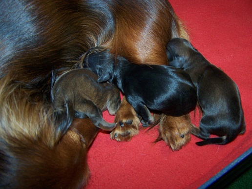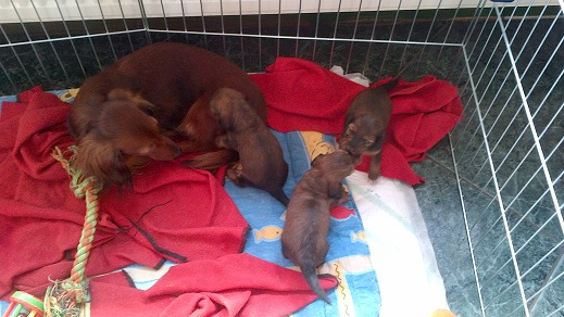 Het nest van Gaby van de Karesterhburg en Senna van de Rossonero zijn geboden op 20 December 2011. Beiden teckels zijn kaninche, rood en langharig. Het nestje bestaat uit drie reutjes: 1 black and tan en 2 roodharig.